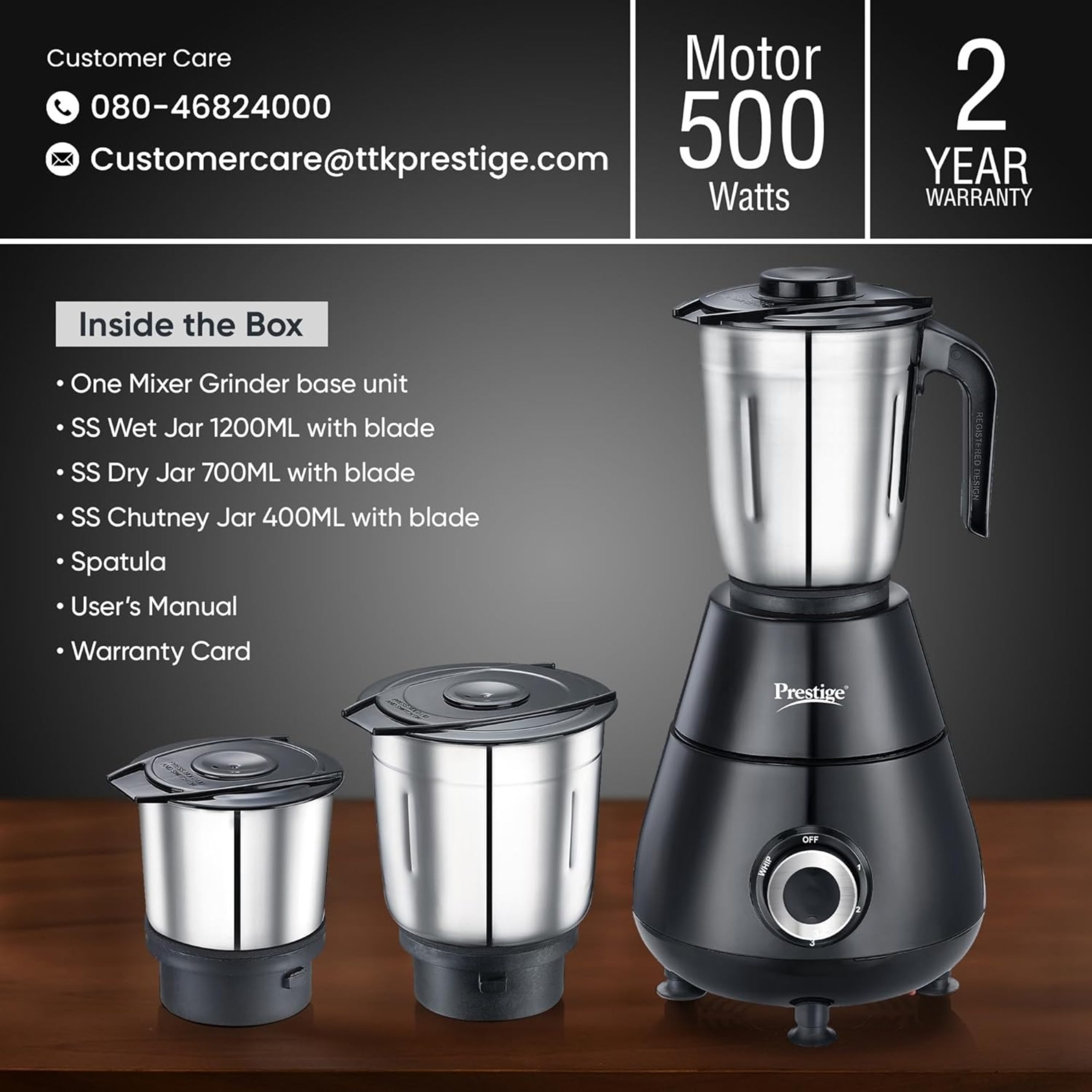 The mixer comes with super-efficient stainless steel blades, sturdy ergonomically designed handles for easy grip, and a sparkling mirror finish for a premium look. Built with safety in mind, Prestige ensures reliable usage with a 2-year product warranty. Whether you’re making dosa batter, masalas, or chutneys, this mixer grinder is a dependable choice for every modern Indian kitchen.