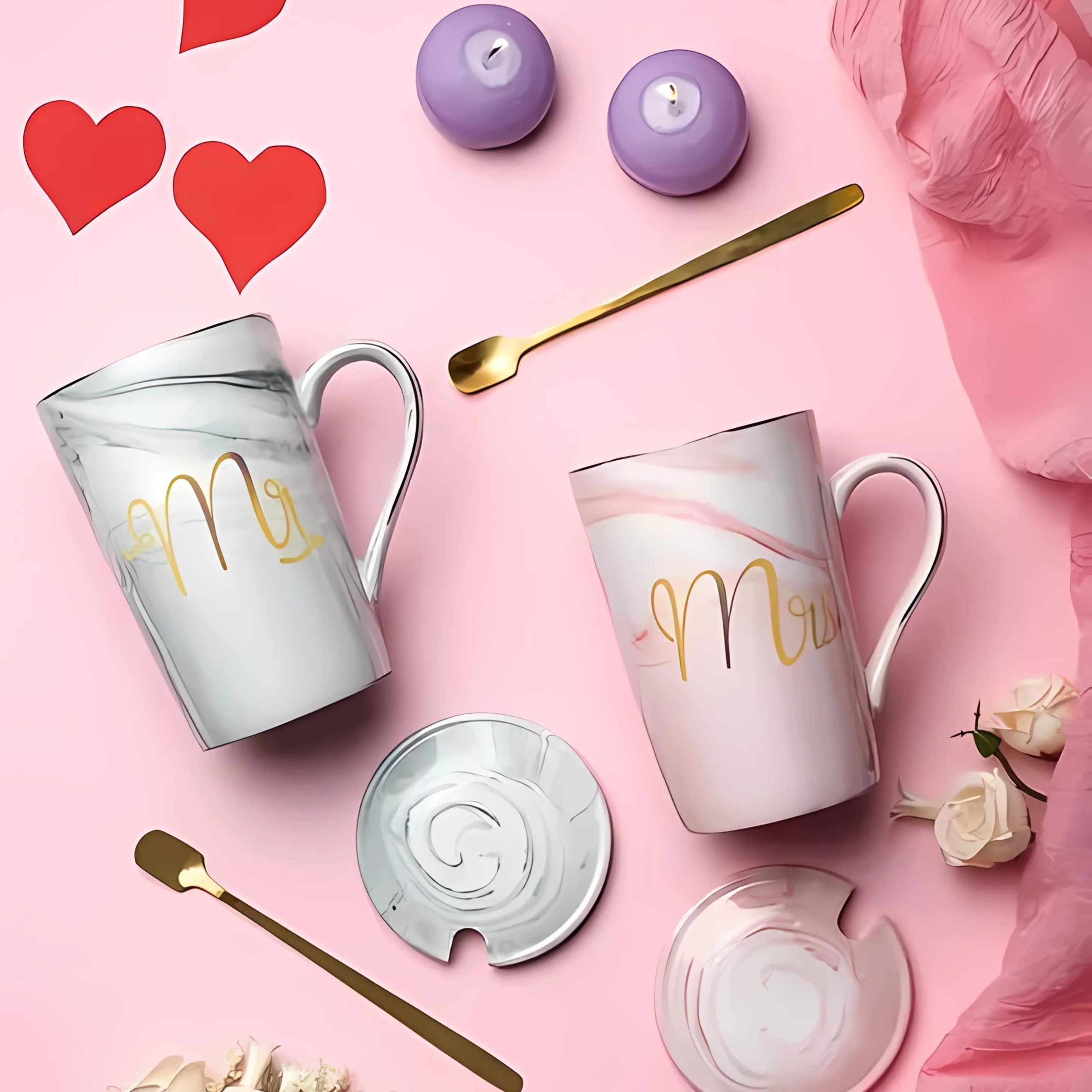 Stylish Mr. & Mrs. ceramic couple mugs with lids and spoons – a perfect wedding, anniversary, or festive gift.