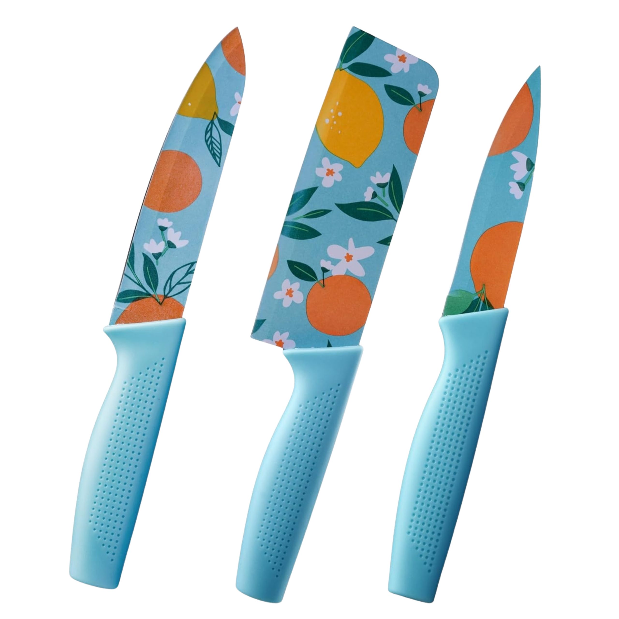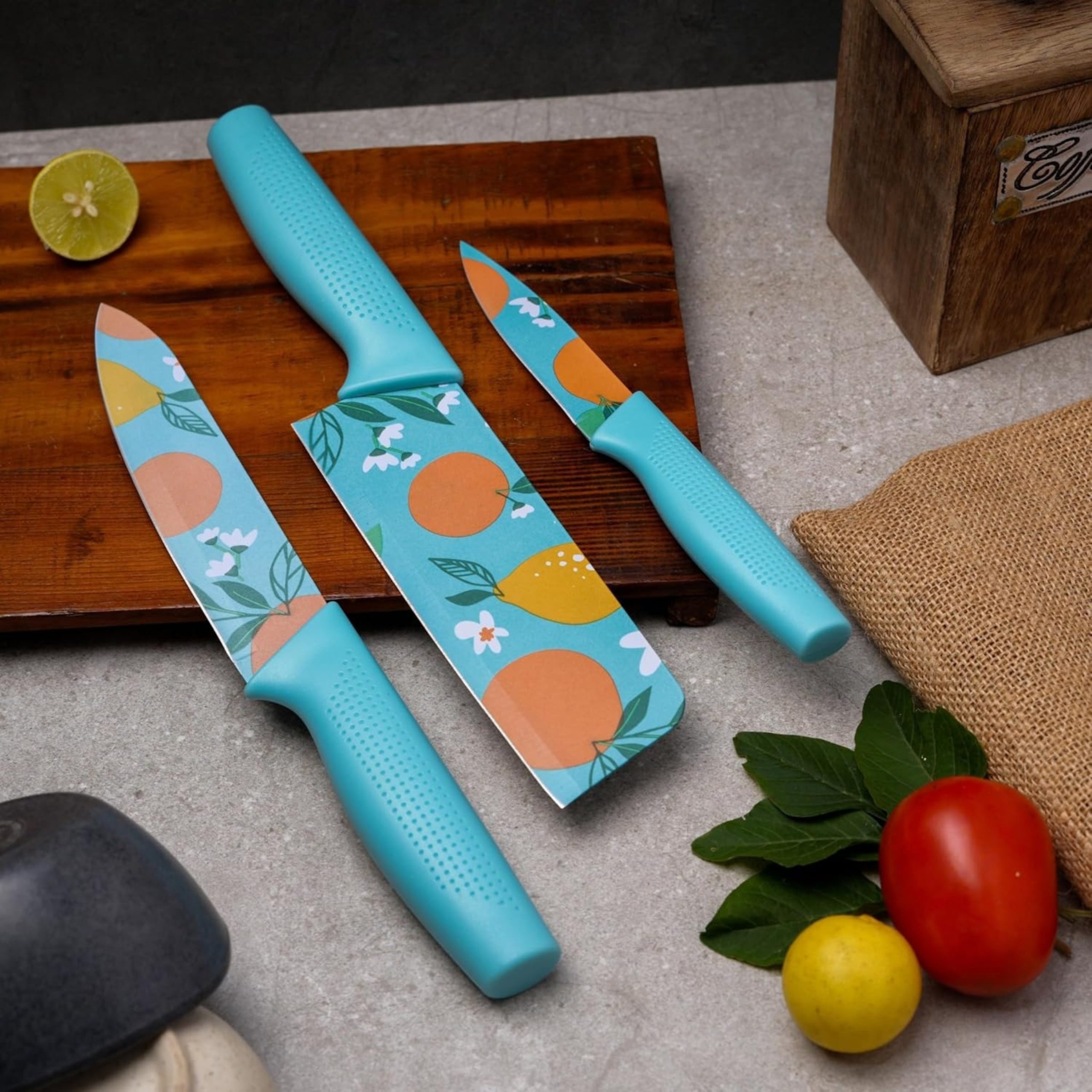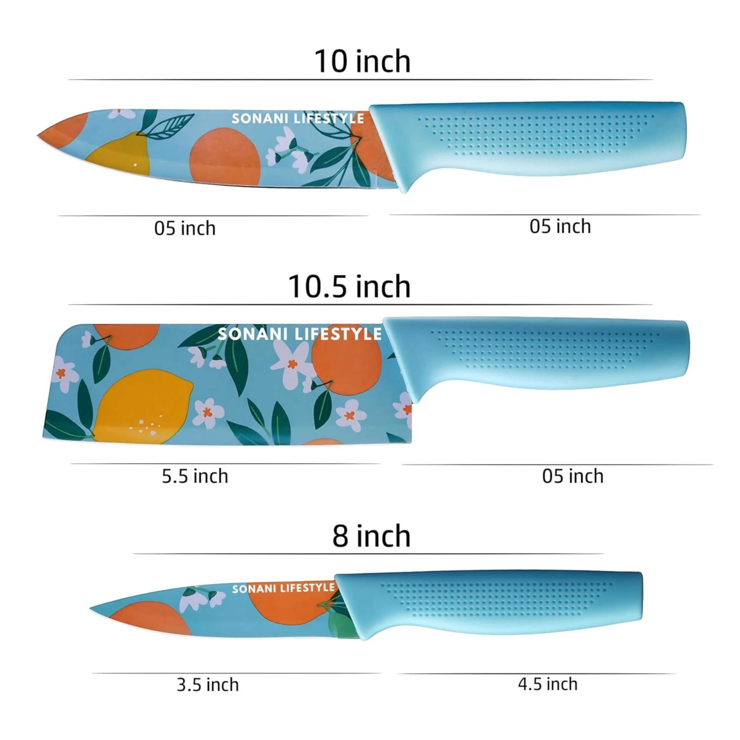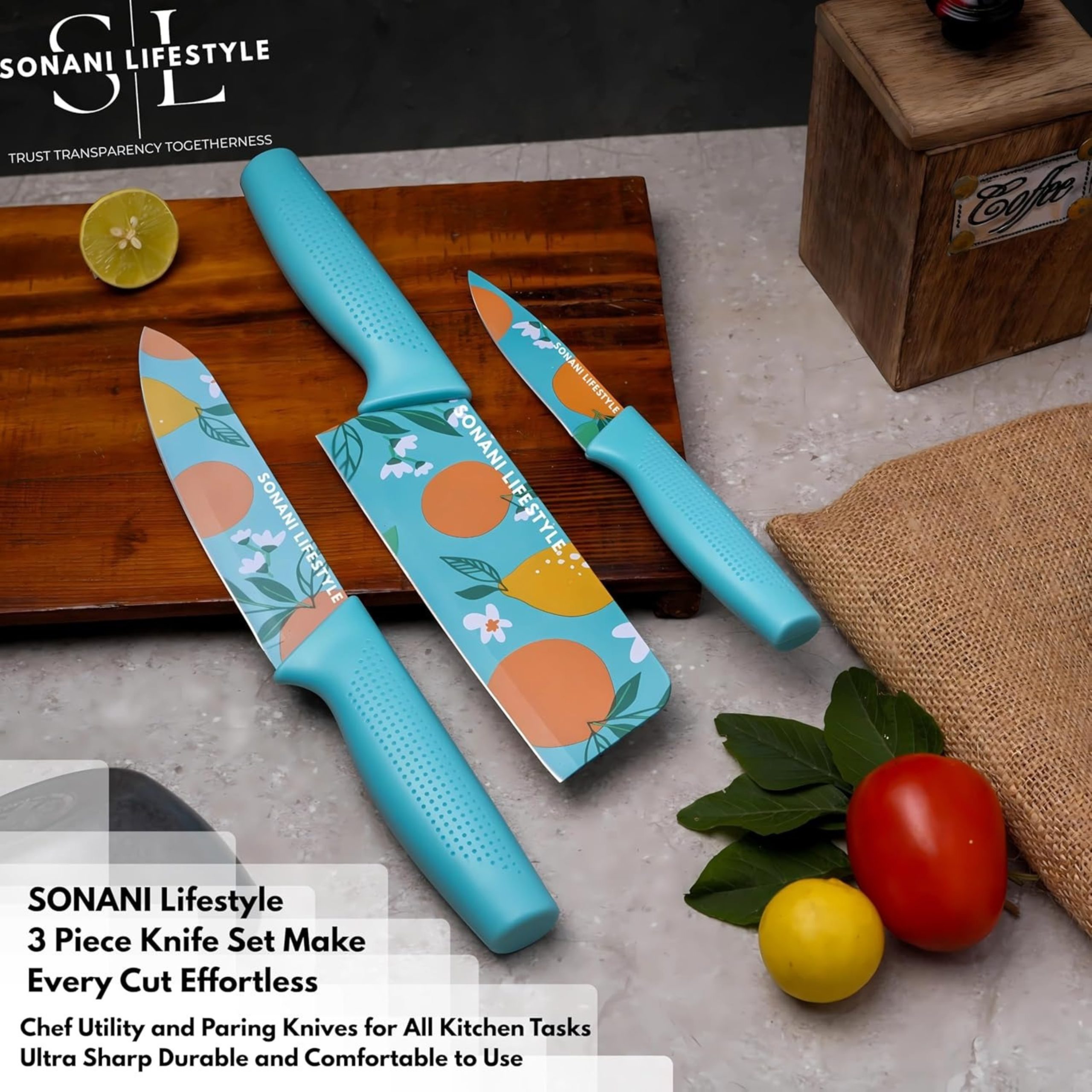 The SONANI Lifestyle Three-Piece Stainless Steel Kitchen Knife Set combines sharpness, durability, and modern style. This set includes a Chef knife, a Santoku knife, and a Utility knife, all crafted from high-carbon stainless steel for precise cutting. The food-grade printed nonstick coating prevents rust, reduces food sticking, and adds vibrant style to your kitchen. Ergonomically designed non-slip handles ensure comfort and safety, making these knives suitable for home cooks and professional chefs alike. Lightweight yet strong, they are perfect for everyday use—whether cutting vegetables, fruits, or meat. With their colorful design and premium feel, they also make a thoughtful gift for cooking enthusiasts.